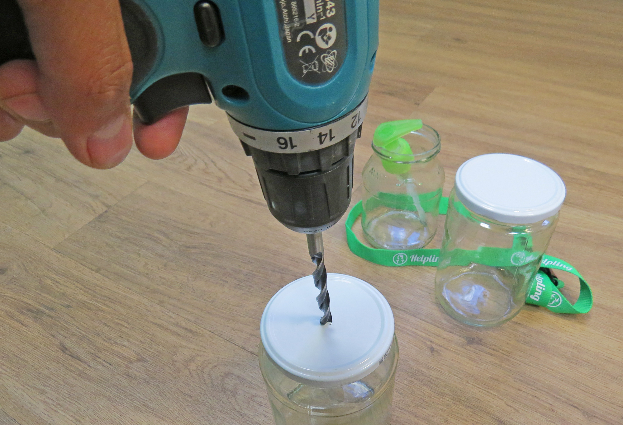Drill a hole into the lid at the marked spot without exceeding the marked diameter. If in doubt, make the hole small at first and then drill it out to the right size carefully. Leave the lid on the glass jar while drilling to prevent damaging your furniture or floor.